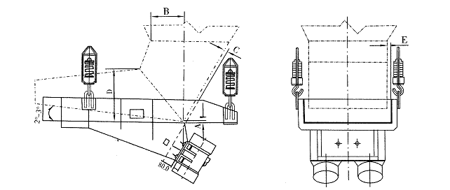 本系列電機(jī)振動給料機(jī)設(shè)計時未考慮倉壓的影響,為保證給料機(jī)的正常運行,必須盡量減少倉壓對給料機(jī)的影響。因此在設(shè)計溜嘴時,應(yīng)用溜嘴的后側(cè)板承擔(dān)料柱的垂直壓力。溜嘴形式及配置可參考圖及表中數(shù)值。