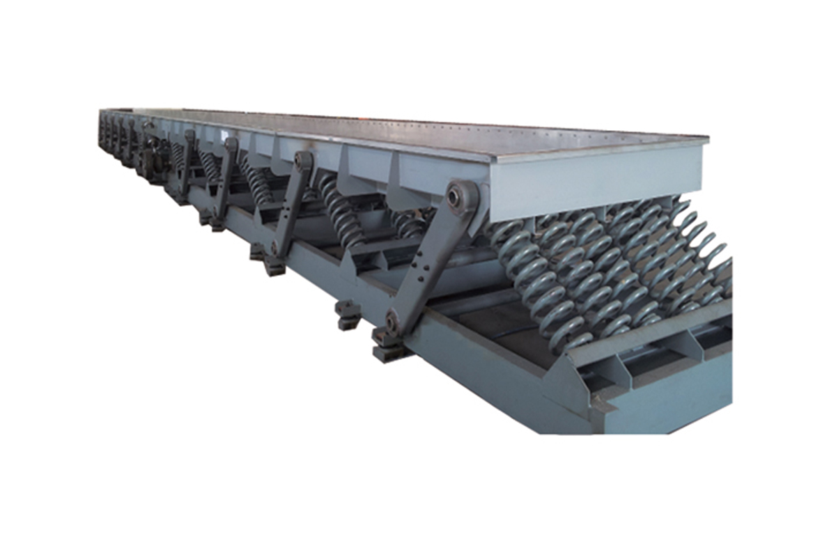 驅(qū)動(dòng)連桿機(jī)構(gòu)由電動(dòng)機(jī),皮帶輪、傳動(dòng)軸、偏心連桿裝置組成。輸送槽與底架之間用螺旋彈簧聯(lián)接,該彈簧是主振彈簧,導(dǎo)向桿起輸送槽振動(dòng)導(dǎo)向作用,輸送機(jī)運(yùn)行中驅(qū)動(dòng)機(jī)構(gòu)使連桿端部作往復(fù)運(yùn)動(dòng),而連桿通過其端部的螺旋彈簧帶動(dòng)輸送槽作往復(fù)運(yùn)動(dòng),使物料沿振動(dòng)方向被連續(xù)拋起向前跳躍,達(dá)到輸送物料的目的。