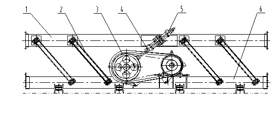 FZS型單質(zhì)體連桿振動(dòng)輸送機(jī)的結(jié)構(gòu)由1輸送槽、2主振板彈簧、3驅(qū)動(dòng)機(jī)構(gòu)、4連桿、5連桿螺旋彈簧、6底架等組成。驅(qū)動(dòng)機(jī)構(gòu)由電動(dòng)機(jī),皮帶輪、傳動(dòng)軸、偏心裝置組成,輸送槽與底架之間用板彈簧聯(lián)接,該板彈簧既是主振彈簧,又起輸送槽振動(dòng)導(dǎo)向作用,輸送機(jī)運(yùn)行中驅(qū)動(dòng)機(jī)構(gòu)使連桿端部作往復(fù)運(yùn)動(dòng),而連桿通過其端部的螺旋彈簧帶動(dòng)輸送槽作往復(fù)運(yùn)動(dòng),使物料沿振動(dòng)方向被連續(xù)拋起向前跳躍,達(dá)到輸送物料的目的。